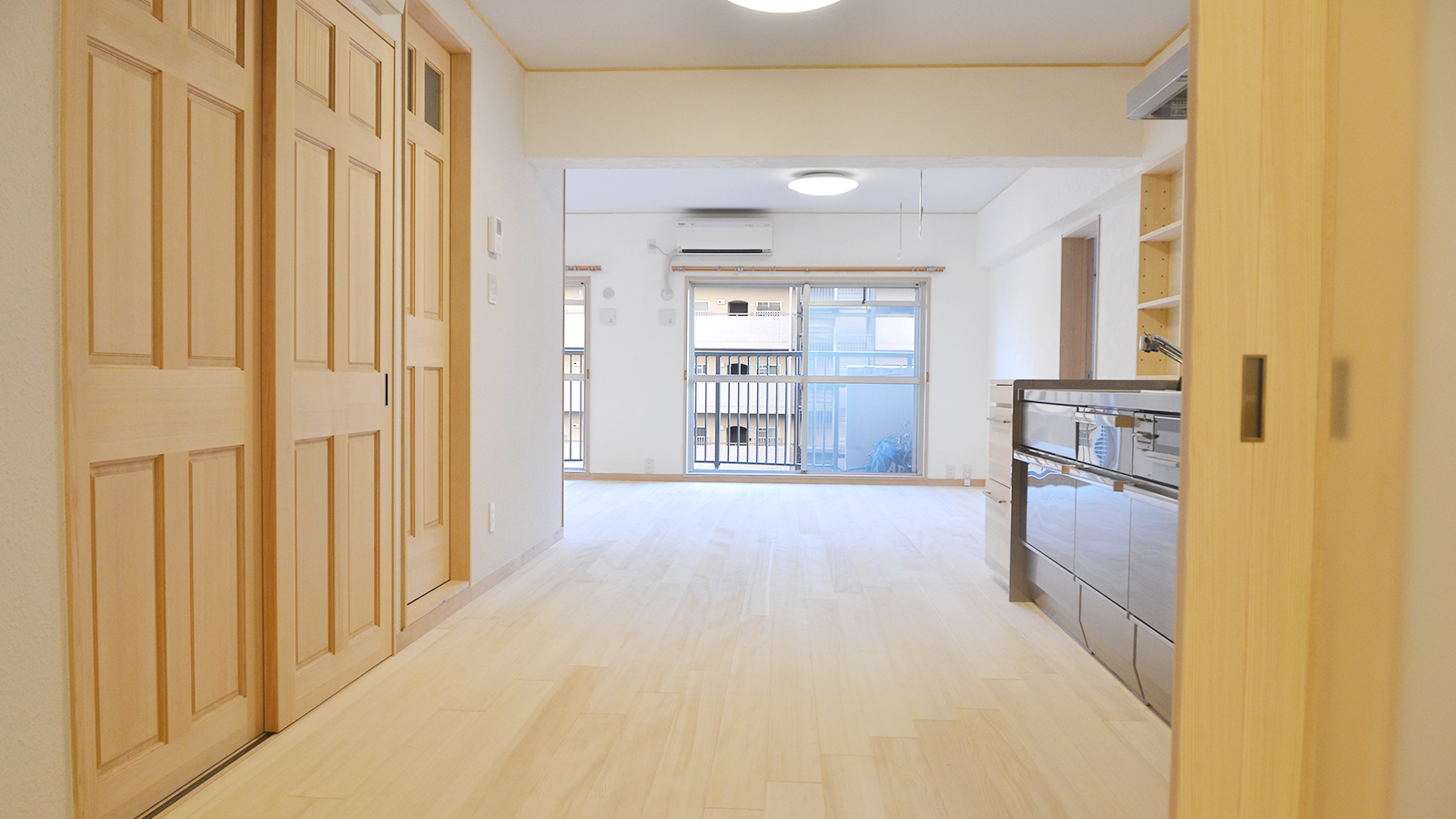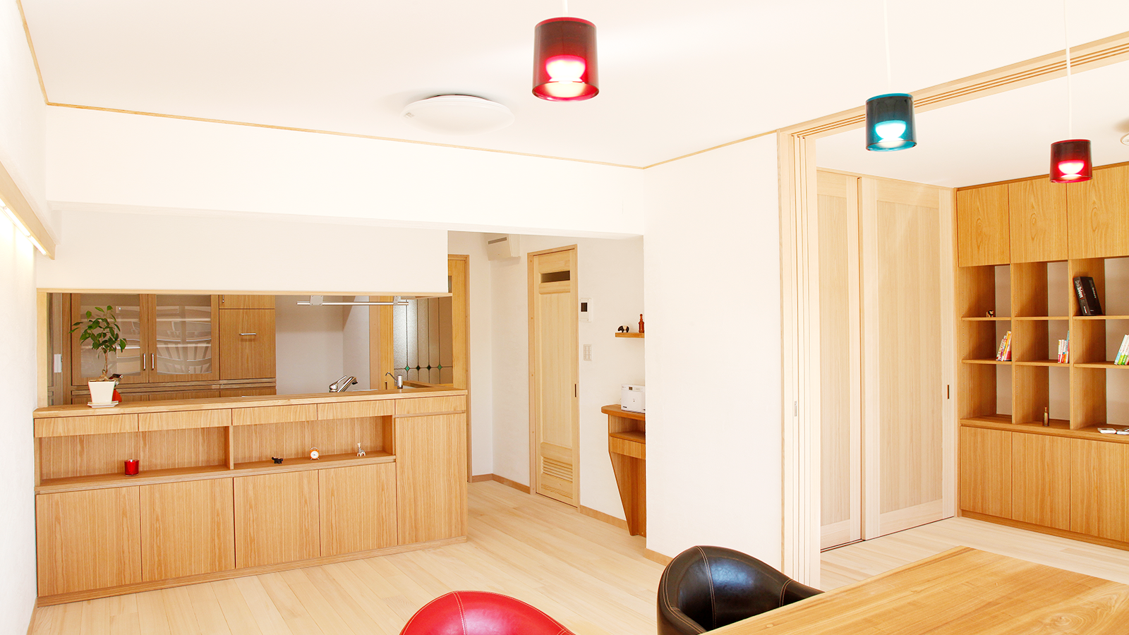 廊下で分断されていたダイニングキッチンとリビングを一体化し、家族や友人がワイワイ集まれる明るいLDKを実現した。南側に広い空地を確保することで、室内いっぱいに光と風が巡る伸びやかな空間が誕生。これまで想像できなかった開放感と使い勝手の良さを手に入れた。