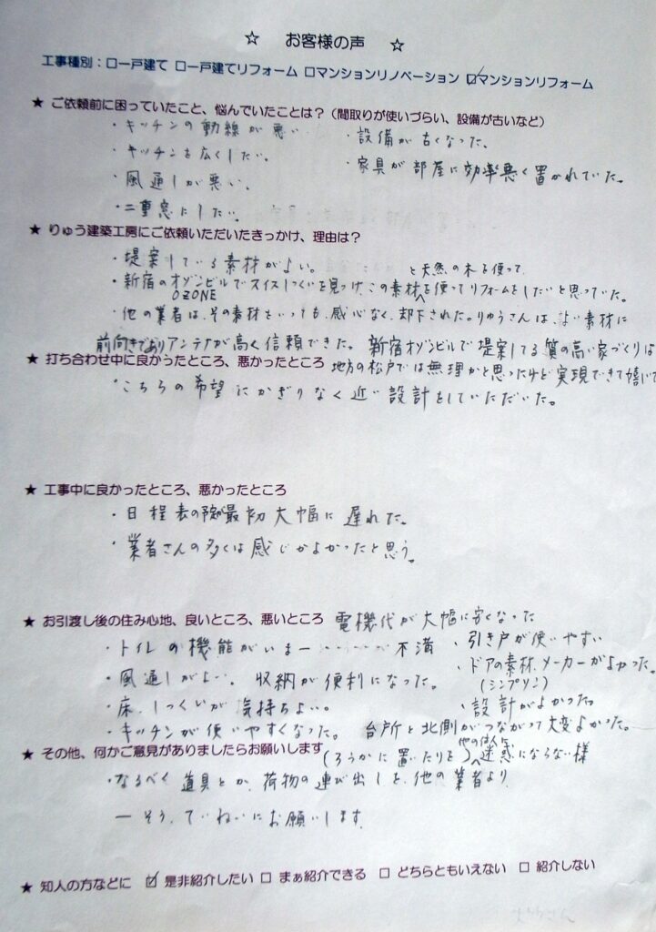 ご依頼前に困っていた事、悩んでいた事は? キッチンの同線が悪い、設備が古い、広くしたい! 風通しが悪い。家具が効率悪く置かれていた。 りゅう建築設計にご依頼いただいたきっかけ、理由は? 提案している素材が良い。新宿のショールームで「スイス漆...