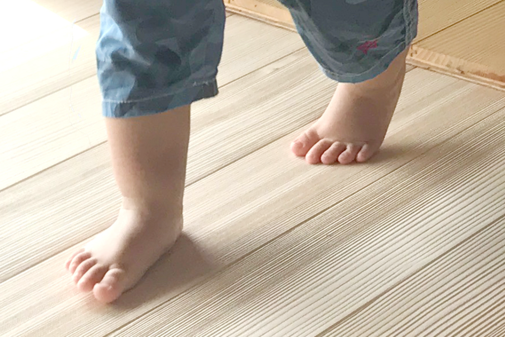 素足で「もみの木」の床に触れていただくと、やさしさを感じます。「もみの木」には適度な弾力があり、歩行時や衝突時のショックを和らげてくれ、膝や腰にもやさしいんです。
