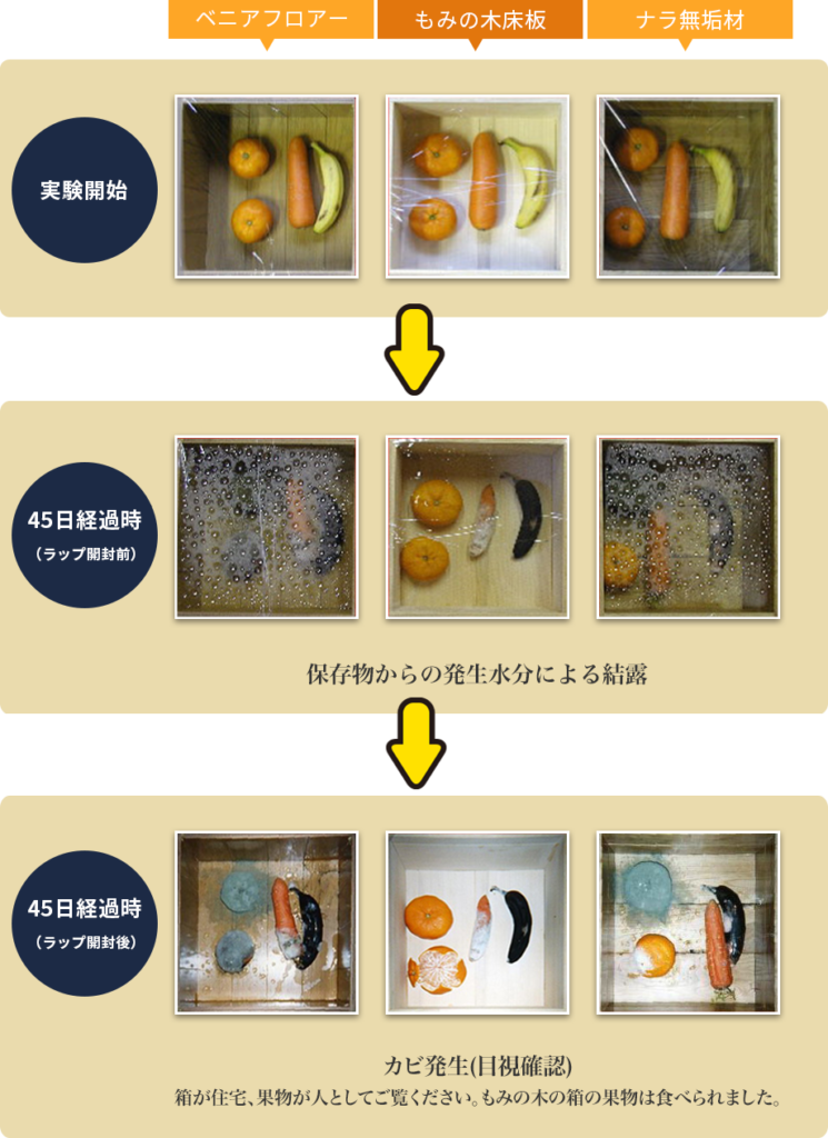 べニアフロアー、もみの木床板、ナラ無垢材で作った高気密状態の箱に果物を入れて、結露の様子を実際に比較しました。