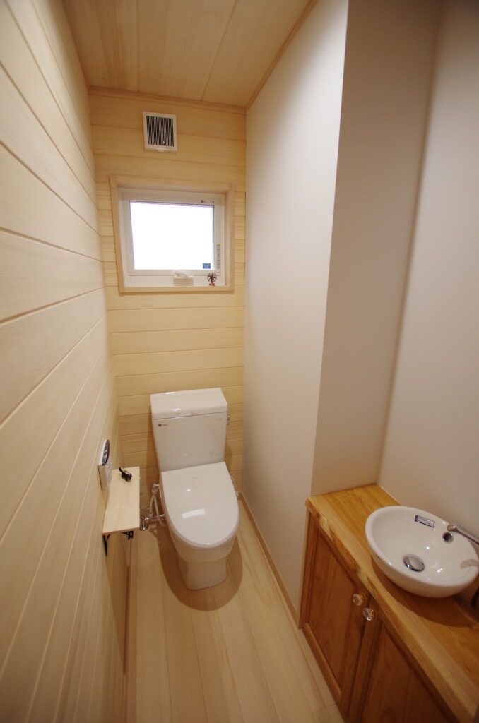 トイレの内装は消臭効果抜群の「もみの木」で仕上げました。男性は飛び跳ね防止のシッティングで使用して戴きます。