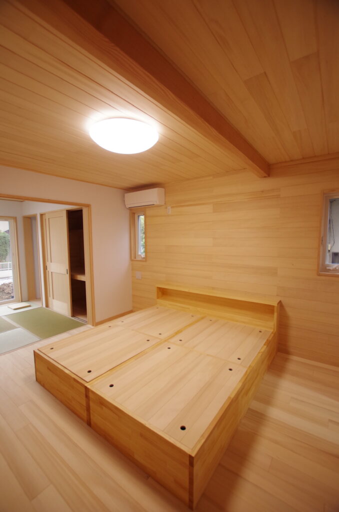 ベットも「もみの木」の特注品。ベット下は大きな収納になっています。