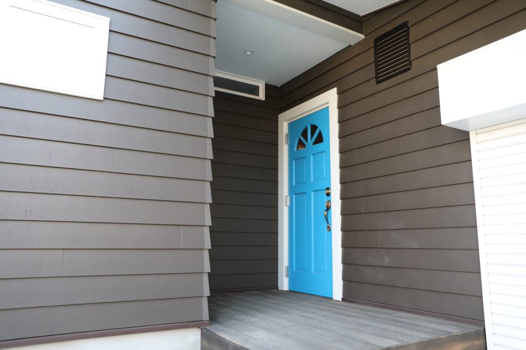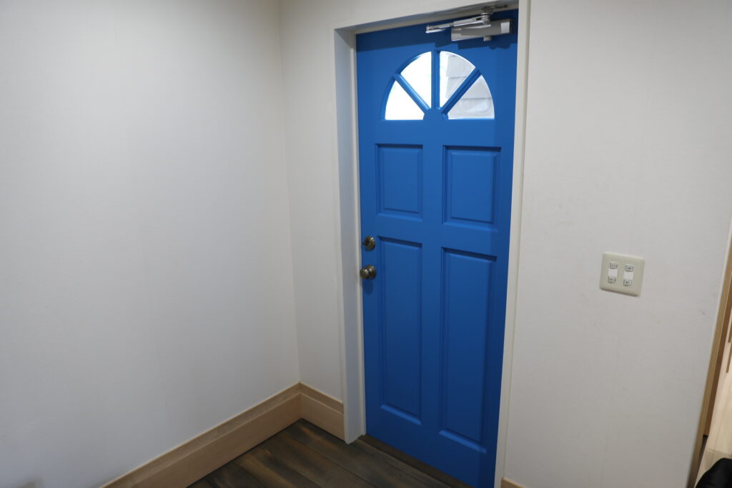 アプローチから玄関までへの床も木材で温もりを感じられる玄関。青い玄関がビビッと感を演出!