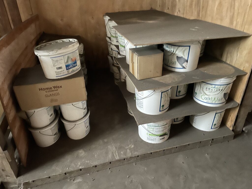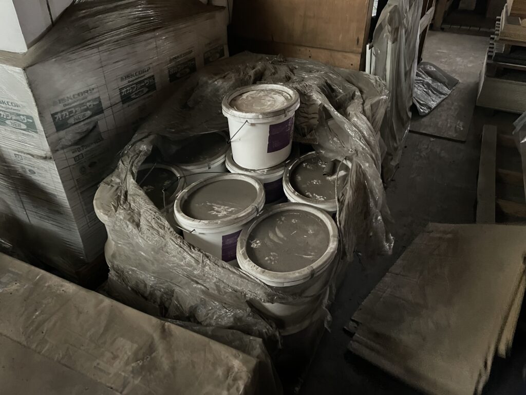 当社では内装材の仕上げに「スイス漆喰」を使用していますが、ある倉庫にこの「スイス漆喰」が眠っているのを発見しました!当社で取引のある問屋さんなのですが、ある理由で30ケースほどの材料が倉庫の一部を占領しています。